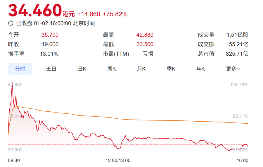 2026年1月2日,港股首个往复日迎来“开门红”,上海壁仞科技股份有限公司(简称壁仞科技)端庄登陆港交所,成为“港股国产GPU第一股”。壁仞科技开盘后一度涨近120%,总市值超1000亿港元,收盘时涨幅回落至75.82%,总市值达825.71亿港元。